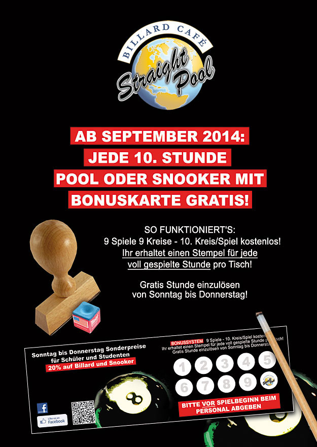 und Studenten 20% Rabatt auf Billard und Snooker.